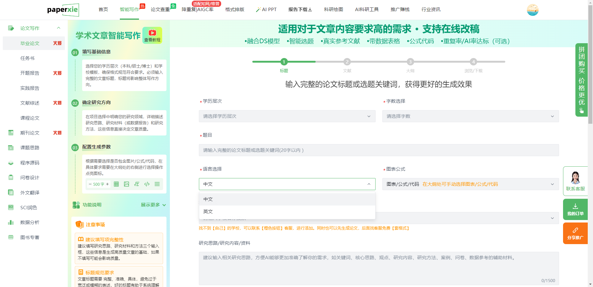 作为国内首款深度适配高校毕业论文规范的全流程 AI 写作平台,PaperXie 聚焦本科、硕士、博士全学历层次,从选题、开题、初稿、降重、格式到答辩,一站式解决所有写作难题。区别于通用 AI 工具的 “一刀切”,它针对不同学历定制专属写作逻辑:本科论文侧重基础规范、实践应用,自动生成 8000-15000 字标准框架;硕士论文强化理论深度、实证分析,突出研究创新;博士论文聚焦前沿领域、学术贡献,保障内容严谨性。选择学历后,AI 自动匹配学术标准、文献量级和逻辑深度,从根源避免 “内容太浅”“不符合学历要求” 的问题。同时,它覆盖毕业论文全生命周期,提供选题推荐、开题报告 / 任务书生成、论文大纲智能搭建、逐章内容撰写、文献综述自动梳理、查重降重优化、格式精准排版、答辩 PPT 核心页生成等服务,一个平台完成所有环节,不用在文献库、写作器、降重网站间反复跳转,节省 80% 的时间成本。在格式适配方面,支持全国高校格式模板精准匹配,输入学校名称即可自动加载该校页眉、页脚、目录、参考文献、引用格式等全套规范,生成内容时自动套用,改稿过程中格式始终统一,彻底解决 “字体不对、行距错乱、引用格式错误” 等导师最在意的细节问题。此外,它融合 DS 学术模型,生成内容贴合真实文献逻辑,无生硬 AI 痕迹,内置智能降重系统,通过句式重构、同义词替换、逻辑重组,将重复率从 50%+ 降至 10% 以下,同时支持 AI 生成率检测与优化,稳定控制在 15% 以内,完美适配知网、万方、维普等所有查重系统,规避学术风险。还搭载科研绘图工具,自动生成实验流程图、数据可视化图表、科研示意图,适配理工科、医学类论文需求,支持外文文献翻译、SC 学术润色、数据分析、公式代码生成,补充论文专业细节,生成内容可直接导出 Word、PDF,方便提交与修改。汉语言文学本科生于同学表示,“输入选题和研究思路,10 分钟生成完整大纲,半小时完成文献综述,内容逻辑清晰、贴合专业,格式直接套用学校模板,改稿时在线调整就行,比自己写快了 5 倍”;计算机硕士林同学称,“代码模块和数据分析功能太实用,AI 生成的代码框架可直接微调使用,数据统计逻辑严谨,完美解决技术论文难点”。这款工具适配本科 / 硕士 / 博士全学历学生,尤其是追求高效、需全流程辅助、重视格式规范与查重通过率的毕业生,是毕业论文写作的首选全能工具。