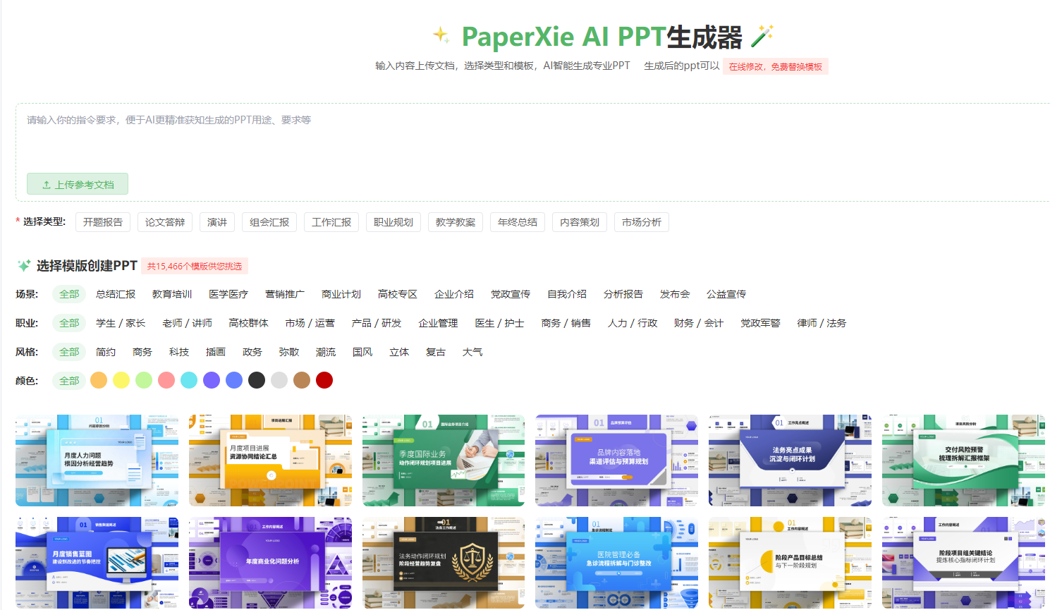 paperxieAIPPT 的模板库收录了 15,466 套专业模板,且持续更新。这些模板并非简单的视觉素材,而是基于不同场景的内容逻辑设计: