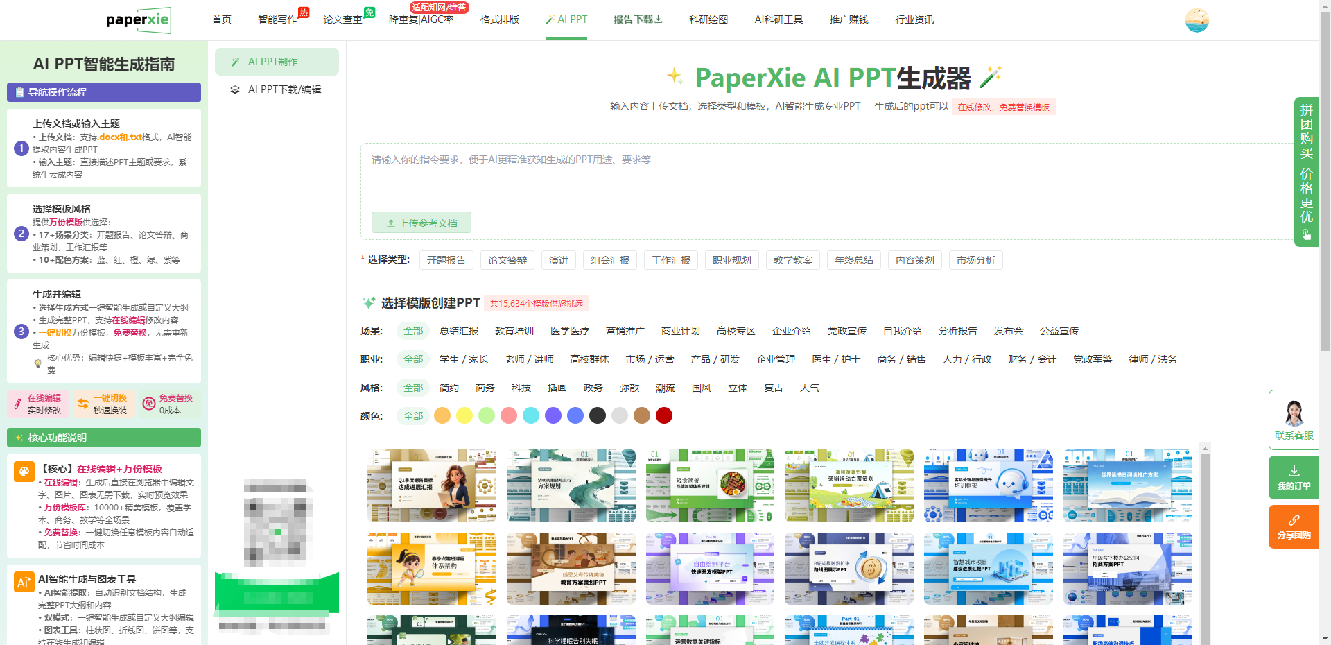 打开 PaperXie 官网,点击顶部导航栏「AI PPT」即可进入制作界面,工具从内容生成、模板选择到编辑优化,全流程贴合论文答辩需求,核心优势可概括为 “智能生成、模板专属、编辑自由、学术适配”。